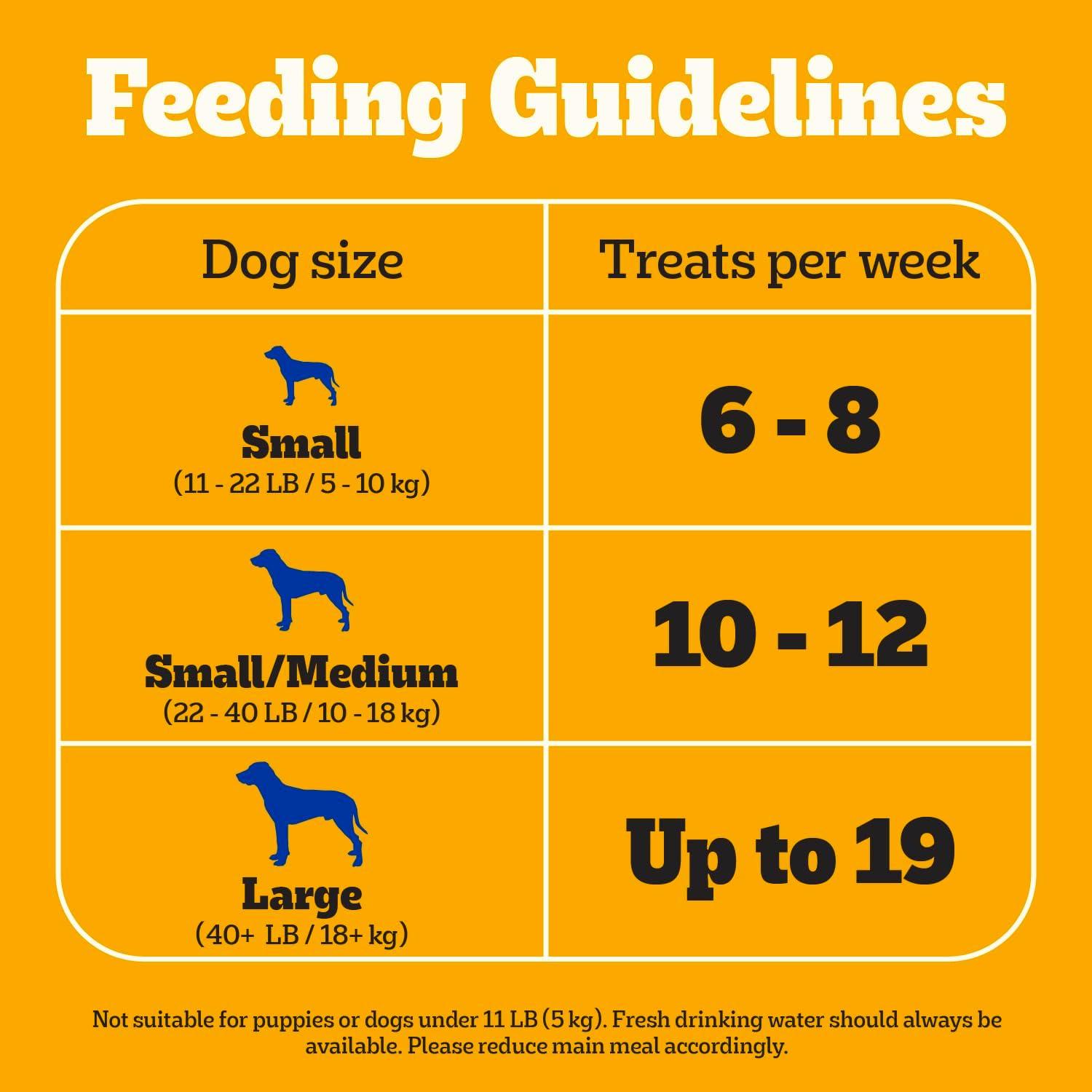 Directions Feeding Guide:: Feed small adult dogs (11 – 22 LB / 5 – 10 kg) 6 – 8 treats per week Feed small/medium adult dogs (22 – 40 LB / 10 – 18 kg) 10 – 12 treats per week Feed large adult dogs (40+ LB / 18+ kg) up to 19 treats per week Not suitable For Puppies or dogs under 11 LB (5 kg). Fresh drinking water should always be available. Please reduce main meal accordingly.
