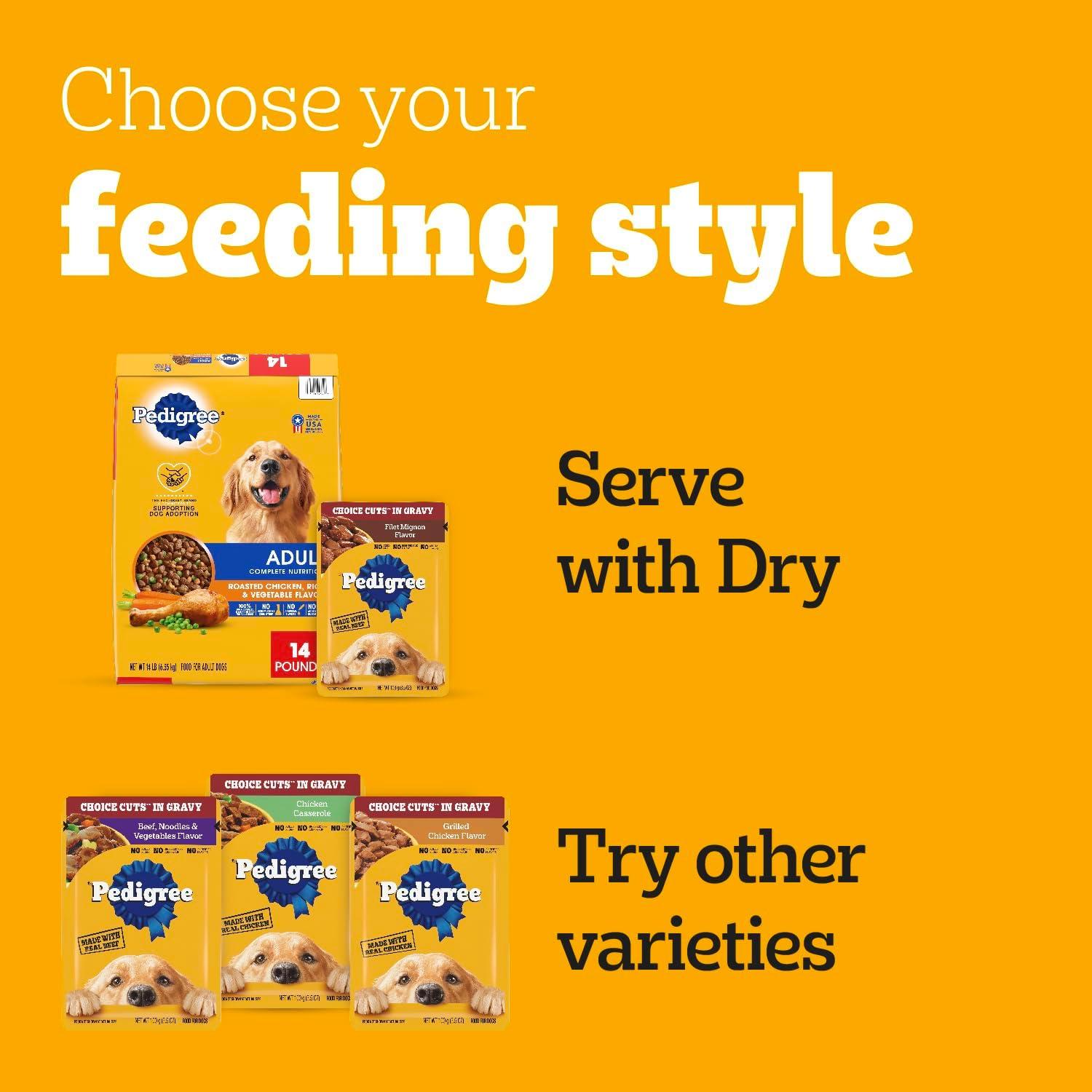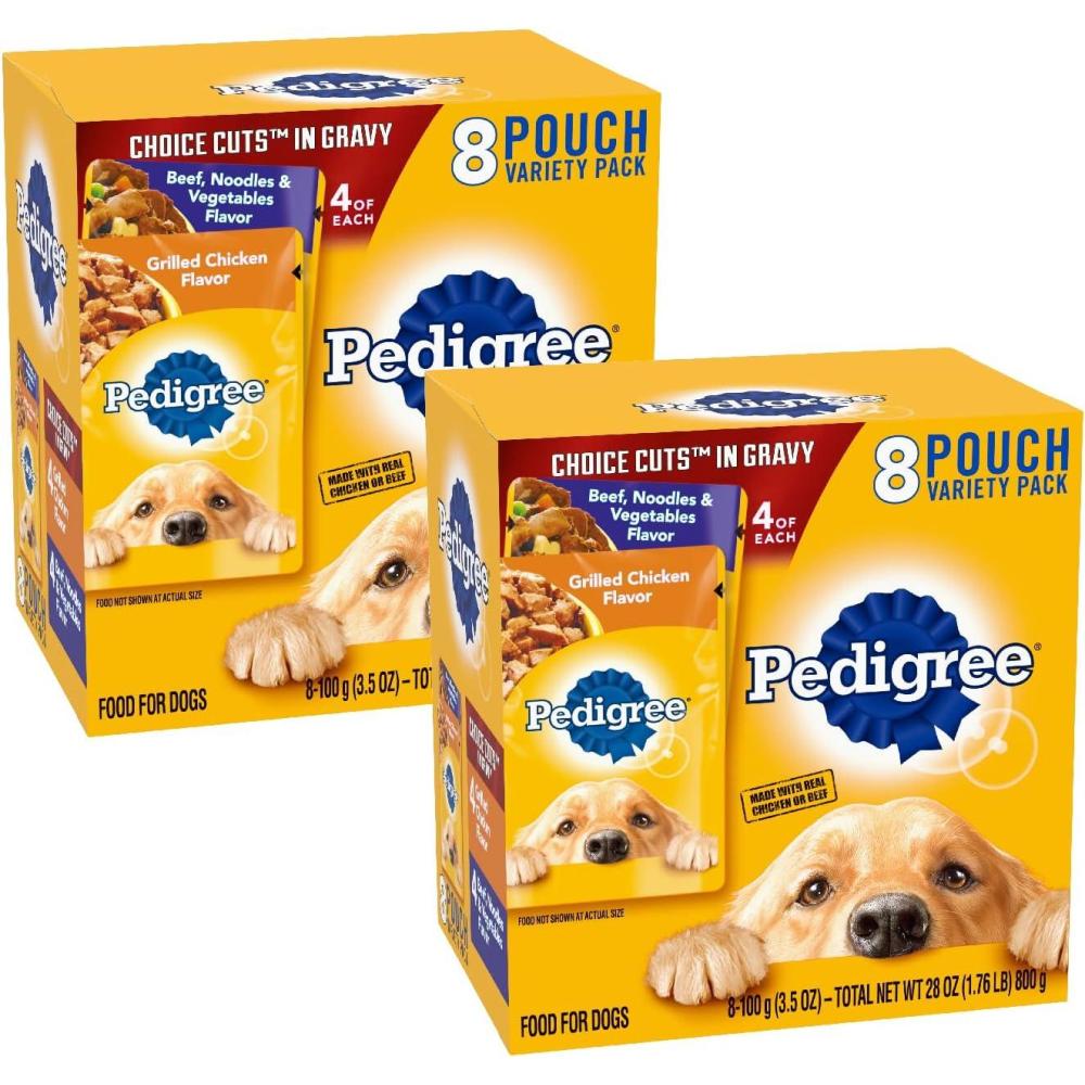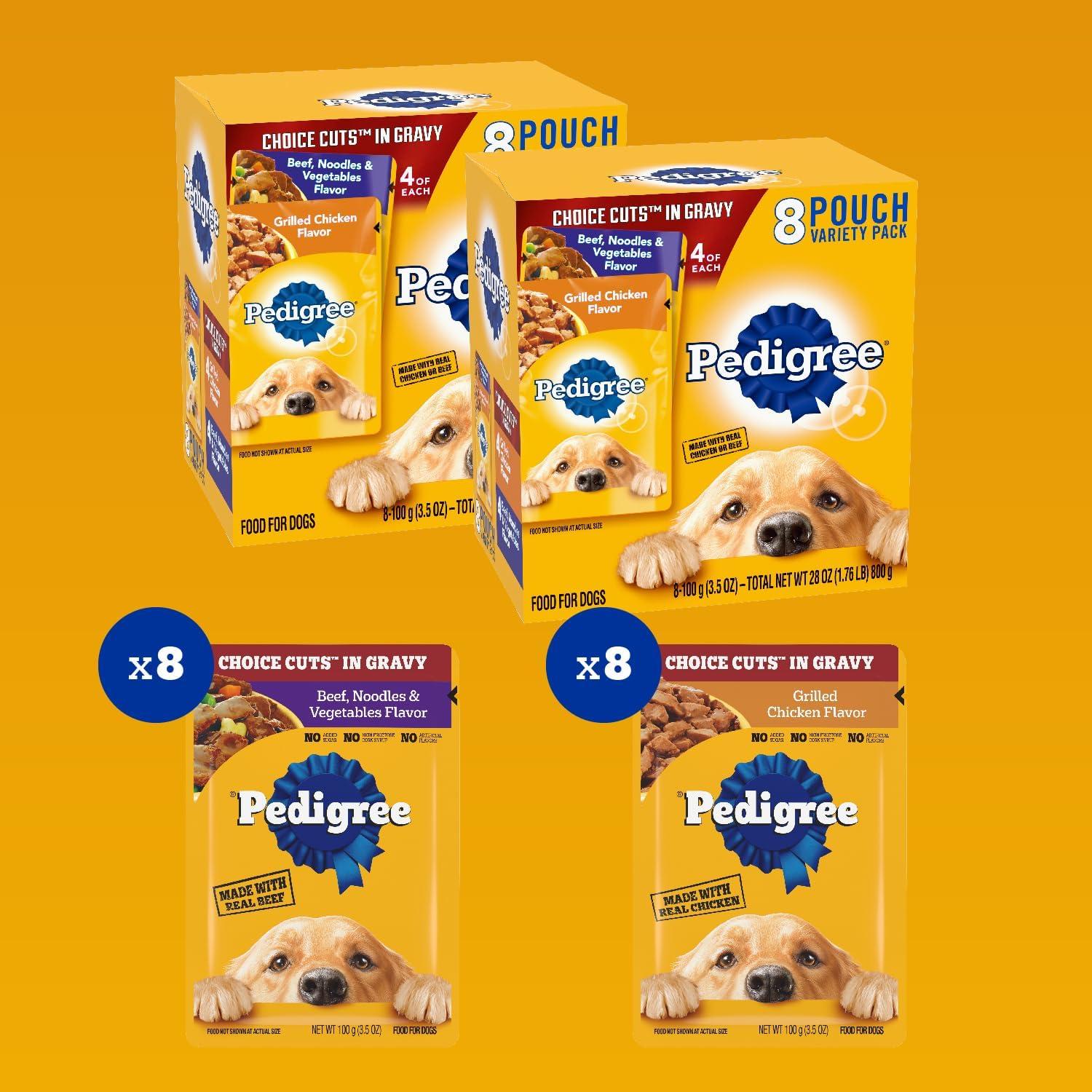 Dogs bring out the good in us. Pedigree brings out the good in them. Express your love for your dog by serving Pedigree Choice Cuts in Gravy Wet Dog Food 16-Count Beef, Noodles & Vegetables and Grilled Chicken Variety Pack. These great-tasting wet dog food recipes are 100% complete and balanced for adult dogs and are made with real meat, bringing a filling and familiar flavor to mealtime. Pedigree Choice Cuts in Gravy Wet Dog Food 16-Count Beef, Noodles & Vegetables and Grilled Chicken Variety Pack features two delicious options: Beef, Noodles & Vegetables Flavor and Grilled Chicken Flavor so your dog can have favorites to choose from. This versatile soft dog food can be served as a topper, mixed with dry dog food, or enjoyed by itself as a complete meal for adult dogs, bringing your dog a variety of ways to indulge. Crafted with no high fructose corn syrup, artificial flavors, or added sugars, Pedigree Choice Cuts in Gravy Wet Dog Food 16-Count Beef, Noodles & Vegetables and Grilled Chicken Variety Pack shows your dog that you care and want them to have great tasting food.