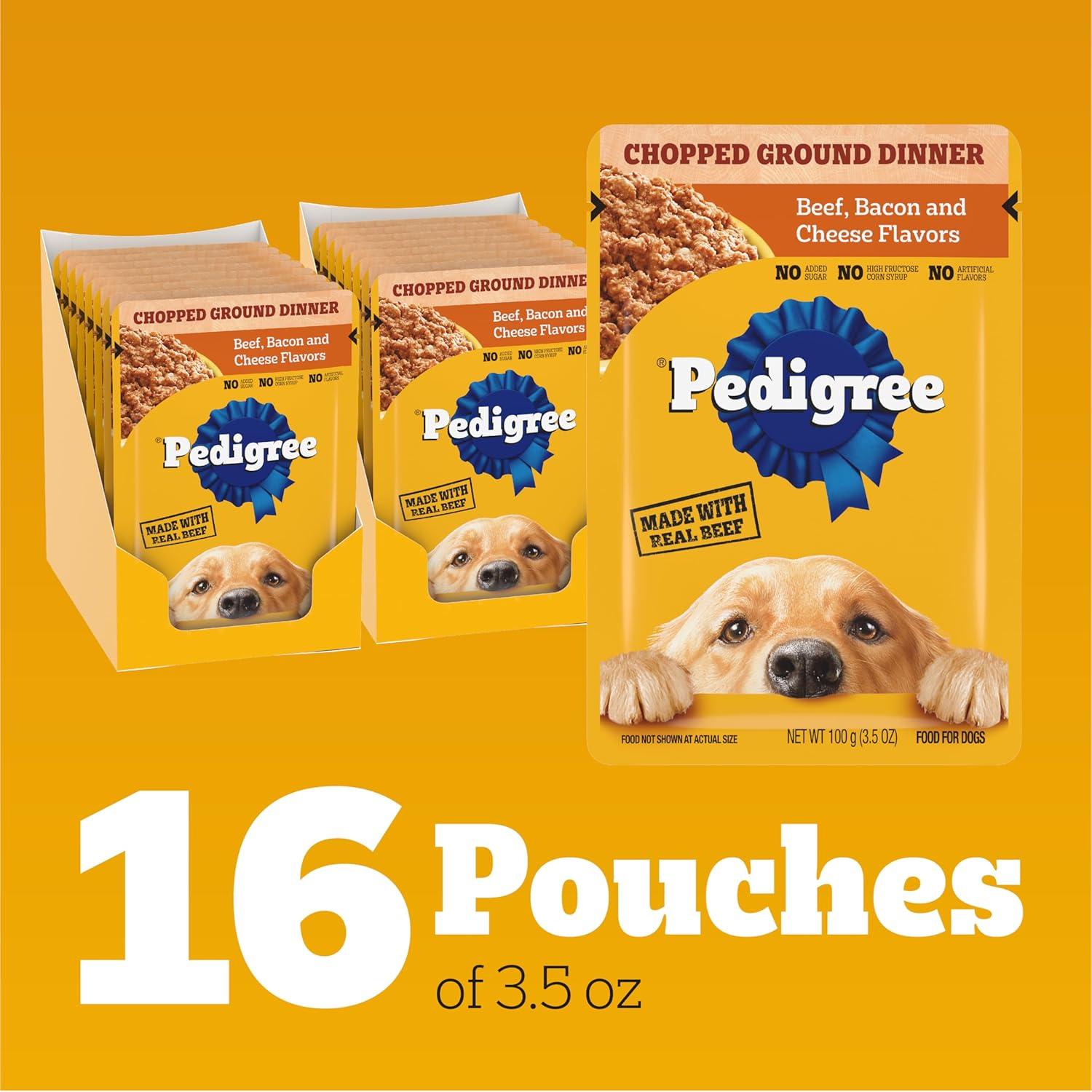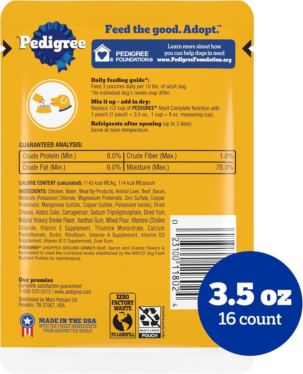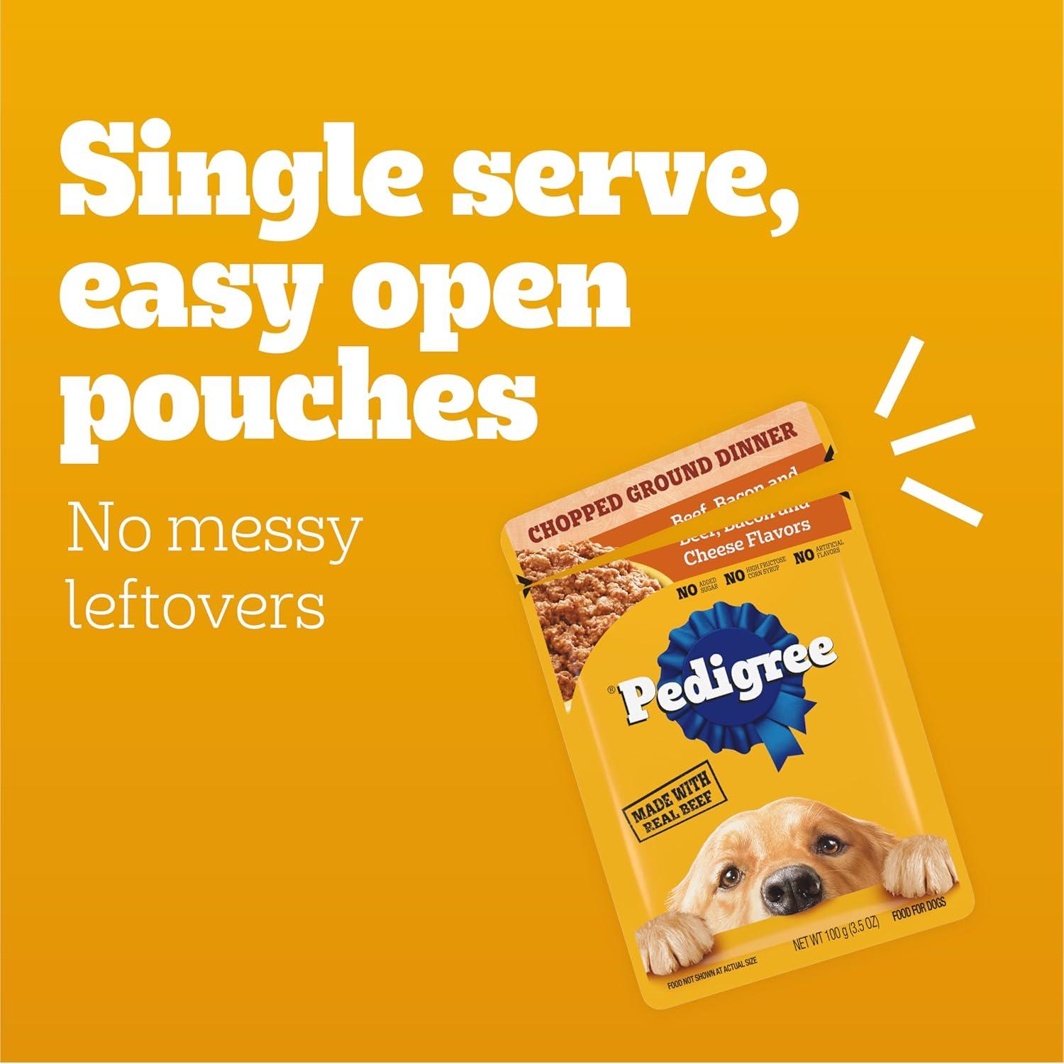 Dogs bring out the good in us. Pedigree brings out the good in them. Express your love for your dog by serving Pedigree Chopped Ground Dinner Dog Food 30-Count Variety Pack. These great-tasting wet dog food recipes are 100% complete and balanced For Adult Dogs and are made with real beef or real chicken, bringing a filling and familiar flavor to mealtime. Pedigree Chopped Ground Dinner Dog Food 30-Count Variety Pack features three delicious options: With Hearty Chicken, Beef, Bacon, and Cheese Flavors, and Bacon and Filet Mignon Flavors, so your dog can have favorites to choose from. This versatile soft dog food can be served as a topper, mixed with dry dog food, or enjoyed by itself as a complete meal For Adult Dogs, bringing your dog a variety of ways to indulge. Crafted with no high fructose corn syrup, artificial flavors, or added sugars, Pedigree Chopped Ground Dinner Dog Food 30-Count Variety Pack shows your dog that you care and want them to have great tasting food.