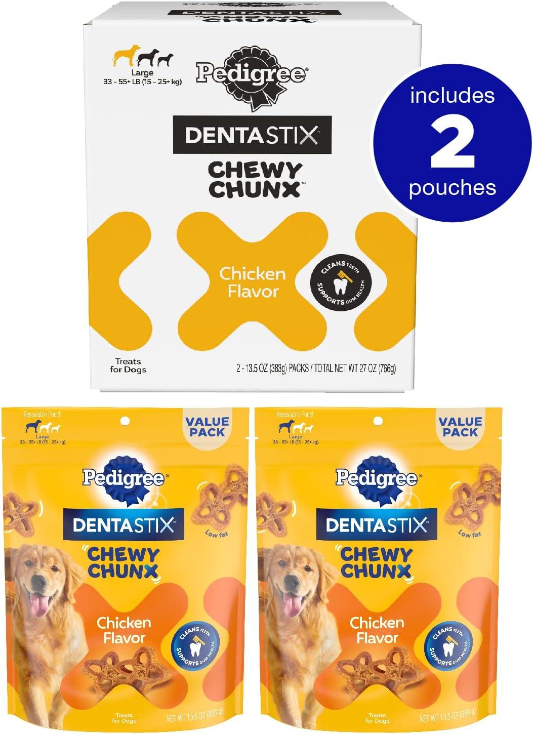 PEDIGREE DentaStix Chewy Chunx Dental Treats for large dogs provide more than just a delicious flavor your dog will love. These dog treats have a chewy texture that works to reduce plaque buildup to clean your dog’s teeth and support gum health as they chew. Each dental treat is under 25 calories with no added sugar so you can feel good about treating your dog anytime. Treat your dog to a healthy smile with PEDIGREE DentaStix Chewy Chunx Dental Treats