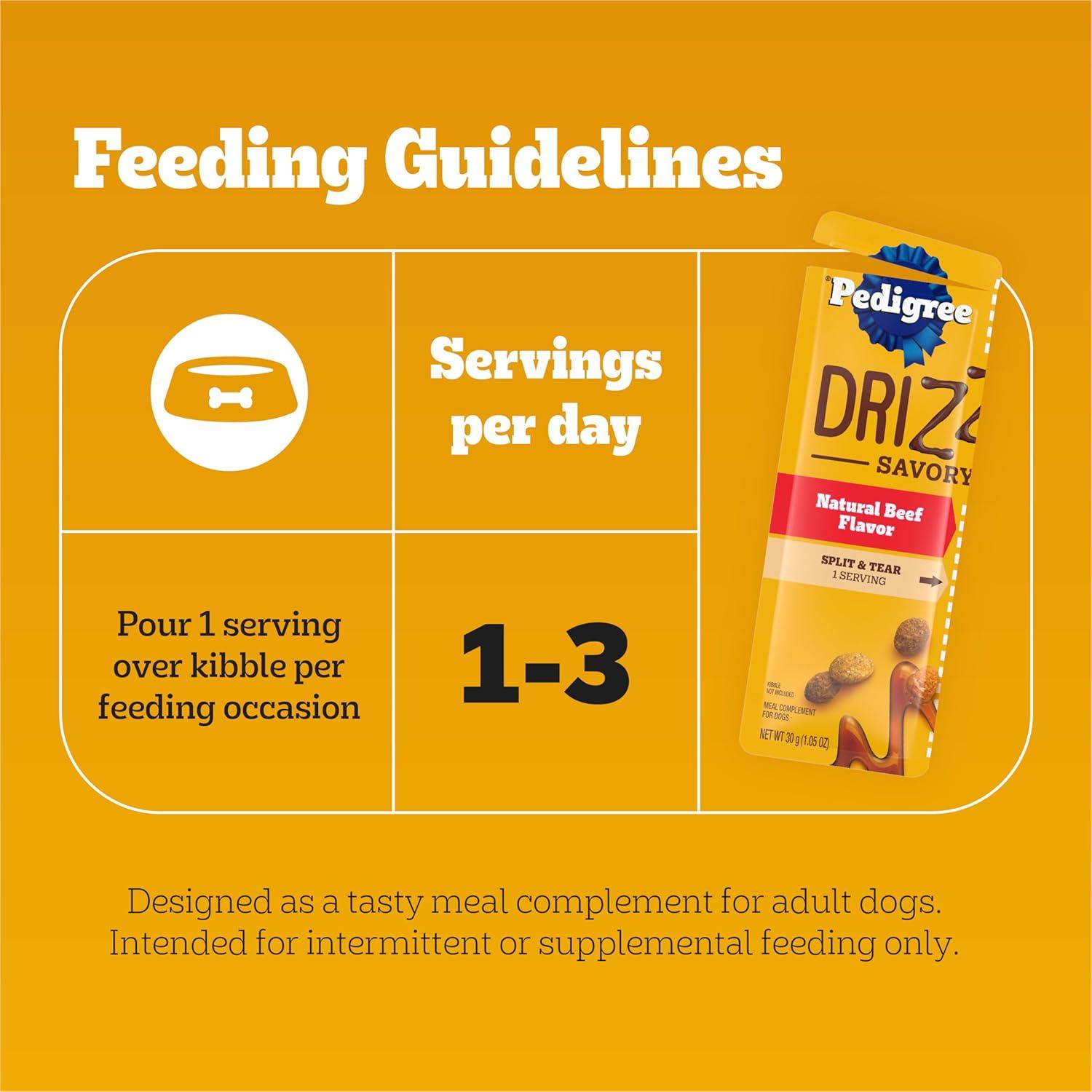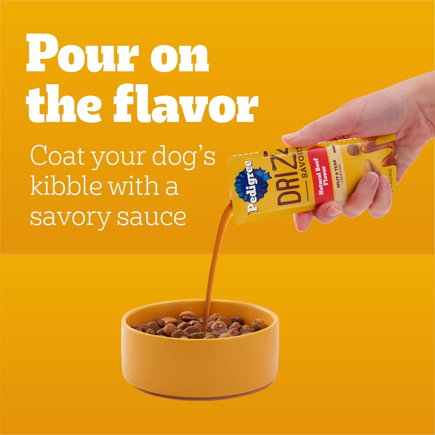 Pour on the Flavor: Coat Pedigree Drizzlers Wet Dog Food Savory Sauce over your dog’s dry dog food and watch the flavor pour in the bowl while maintaining the kibble's crunchiness