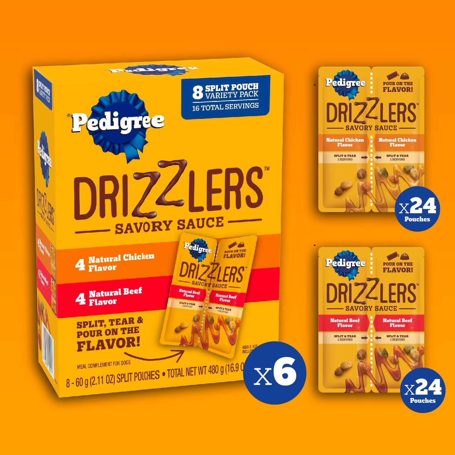 Pedigree Drizzlers Wet Dog Food Savory Sauce Multipack, 60g Dual-Serving Pouches, 8 Count, Pack of 6 (48 Pouches, 96 Servings Total)(Variety: Chicken & Beef)