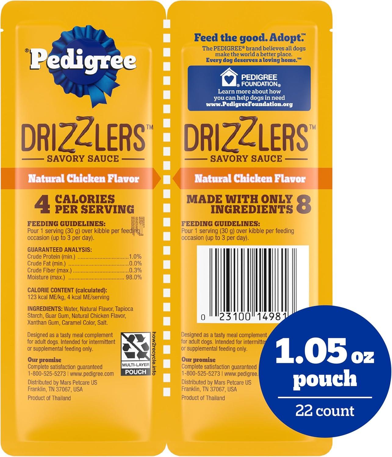Only 4 Calories Per Serving: Pedigree Drizzlers Savory Sauce is only 4 calories per serving. This wet dog meal complement also has only 8 ingredients