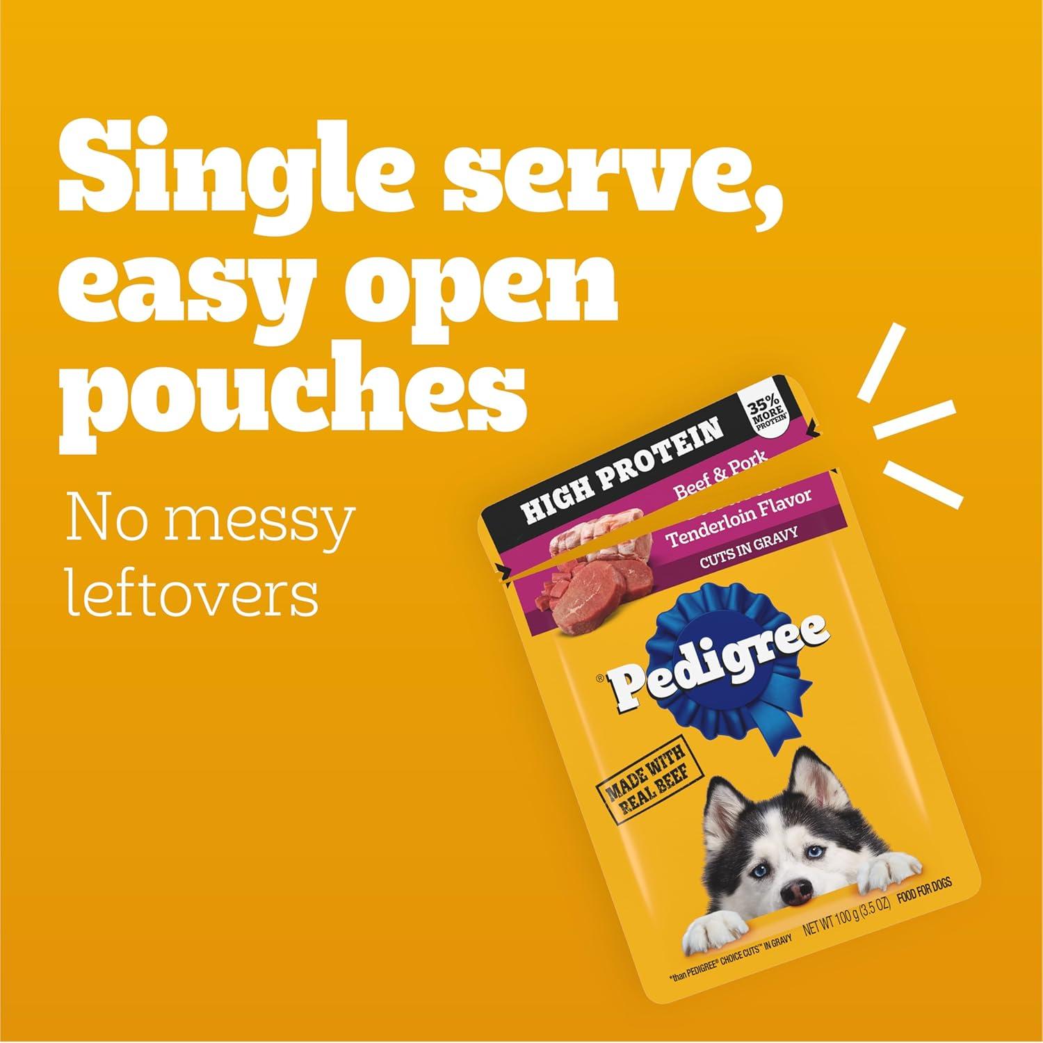 Dogs bring out the good in us. Pedigree brings out the good in them. Express your love for your dog by serving Pedigree High Protein Adult Soft Wet Dog Beef & Pork Tenderloin Flavor. This great-tasting wet dog food recipe is 100% complete and balanced For Adult Dogs and is made with real meat, bringing a filling and familiar flavor to mealtime. Made to be versatile, this soft dog food can be served as a topper, mixed with dry dog food, or enjoyed by itself as a complete meal For Adult Dogs, bringing your dog a variety of ways to indulge. Crafted with no high fructose corn syrup, artificial flavors, or added sugars, Pedigree High Protein Adult Soft Wet Dog Beef & Pork Tenderloin Flavor shows your dog that you care and want them to have great tasting food.