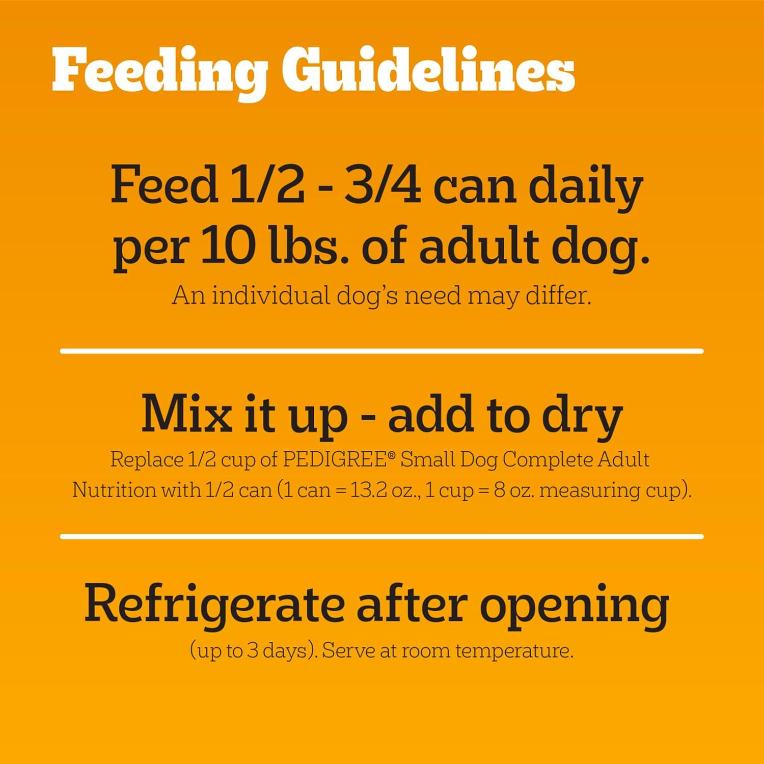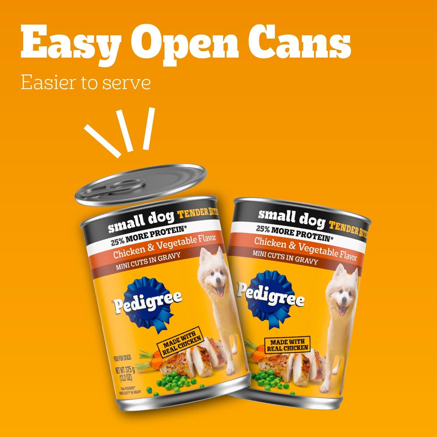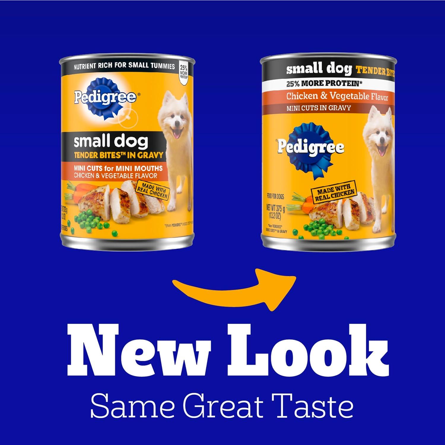 Dogs bring out the good in us. Pedigree brings out the good in them. Express your love for your dog by serving Pedigree Small Dog Tender Bites In Gravy. Pedigree Small Dog Tender Bites In Gravy Wet Food Steak & Chicken Variety Pack contains two nutrient rich recipes that are 100% complete and balanced For Adult Dogs: Pedigree Small Dog Tender Bites In Gravy Wet Food Steak & Vegetable Flavor and Pedigree Small Dog Tender Bites In Gravy Wet Food Chicken & Vegetable Flavor. These canned wet dog food recipes are crafted with mini cuts for small mouths and higher protein for small dog needs. They are made without added sugar, high fructose corn syrup, and artificial flavors. Pedigree Small Dog Tender Bites In Gravy is made in the USA with the finest ingredients from around the world, so you can be confident you’re feeding your dog a quality recipe they will love.